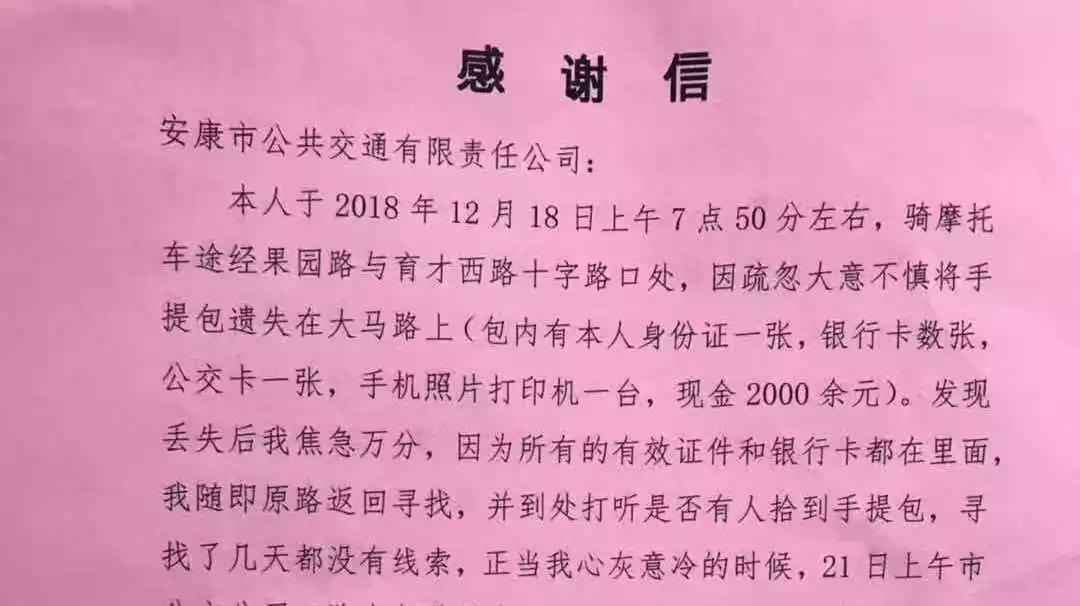 據(jù)失主吉某介紹,她是在12月18日早上的7點50分左右,騎摩托車途徑果園路與育才西路十字路口處,不慎將手提包遺失在馬路上。發(fā)現(xiàn)包丟失之后焦急萬分,隨即原路返回尋找,并四處打聽是否有人拾到手提包,尋找了幾天都沒有線索,正當她心灰意冷的時候,接到了李師傅的電話。兩人確認后,當天下午,失主吉某來到安康市公交公司領(lǐng)取自己遺失的手提包。并將一面印有“拾金不昧品德高尚”的錦旗和一封感謝信送到公交公司車隊辦公室。